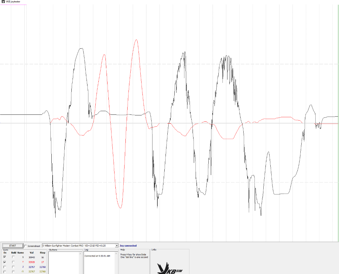 Happening again. gunfighter MK1 pro 1_96_B #50 #10 on each axis smooth cams VKBDevCfg-C v0.90.06 Here are some screen shots, let me know if you need specific screens captured. I ran calibration a few times - on the video I'm moving the stick to each side (only mid-way):video: https://www.screencast....