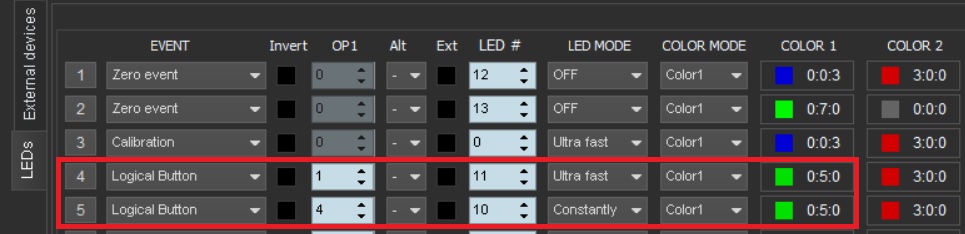 The LEDs on grip are 10 and 11 only I believe, you have to select the correct action and its not always obvious. For example, I have set constant light and flashing when I press the following buttons (logical buttons being the actual buttons on the grip):