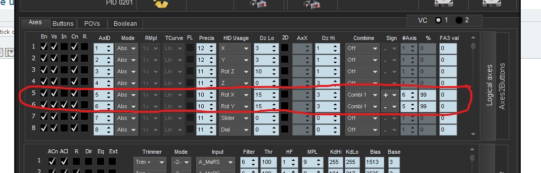 Awesome!! Now we are getting somewhere! With this I can now change the entire orientation by 90 degrees, ie, swap the x and y axis for the mini stick, by assigning Rot Y to axis 6 and Rot X to axis 5. Now, is there a way I can make it a combination? Like Rot X being a combination of 5 AND 6? So that...