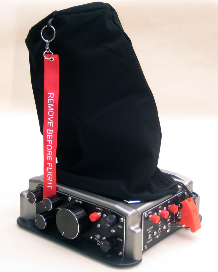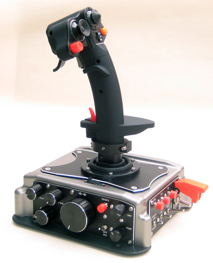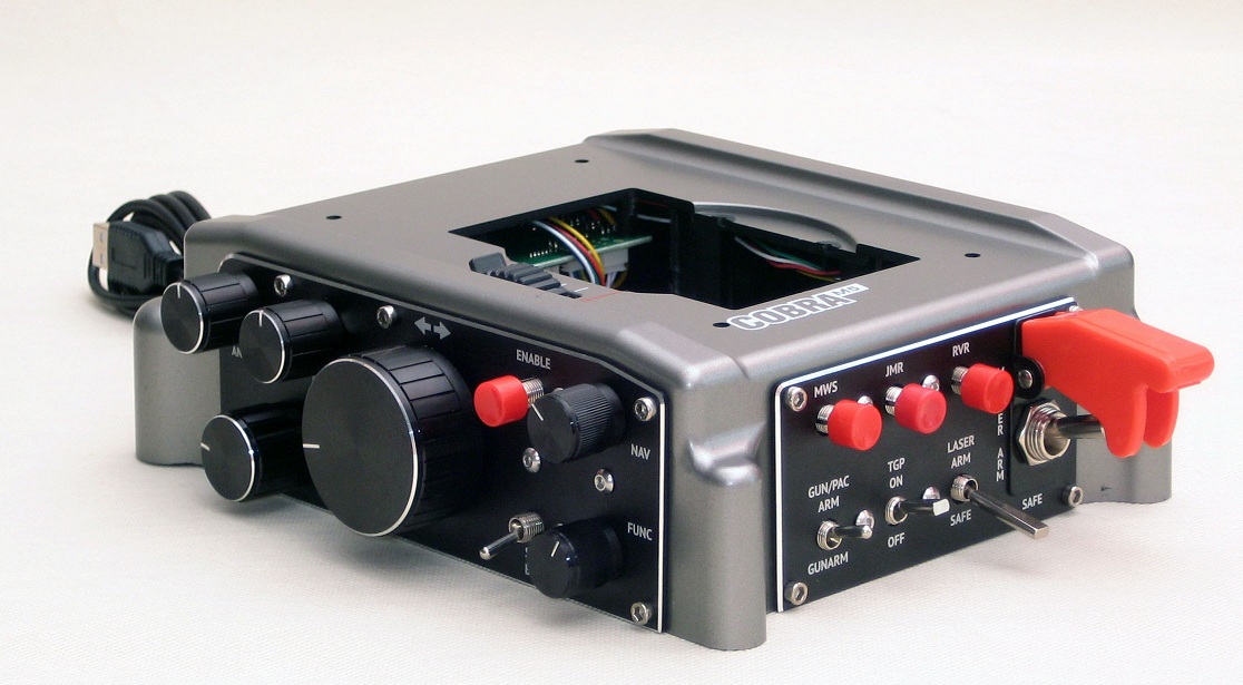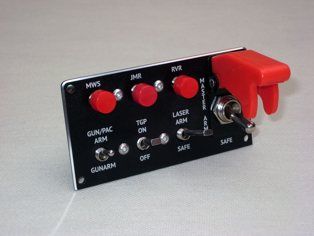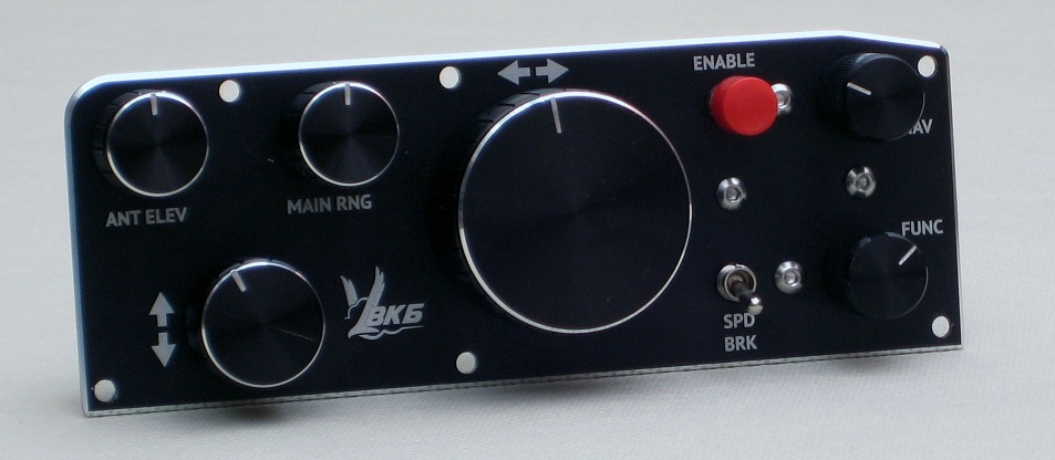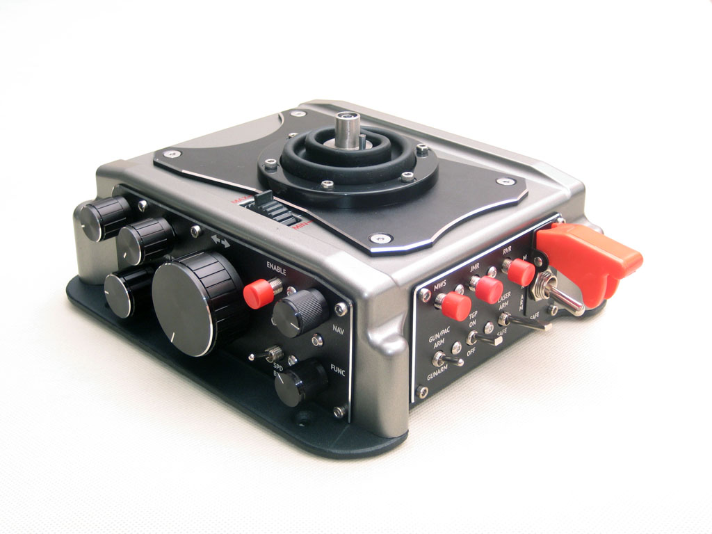 Три кнопки с четким "кликом" срабатывания, трехпозиционный тумблер с коротким штоком с фиксацией в крайних положениях, двухпозиционный тумблер с плоским коротким штоком, двухпозиционный тумблер с плоским длинным штоком, двухпозиционный тумблер под крышкой-предохранителем). В связи с растущим интересом к шлемам виртуальной реальности, мы старались сделать компоновку легко и безошибочно "нащупываемой" (в шлеме виртуальный пилот не видит органы управления, работает ими на ощупь).