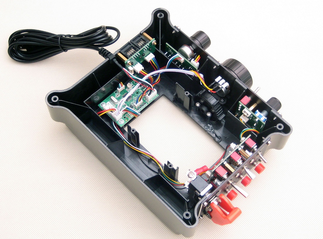 Два энкодера с функцией нажатия, кнопка с четким "кликом", двухпозиционный тумблер, 4 оси на потенциометрах