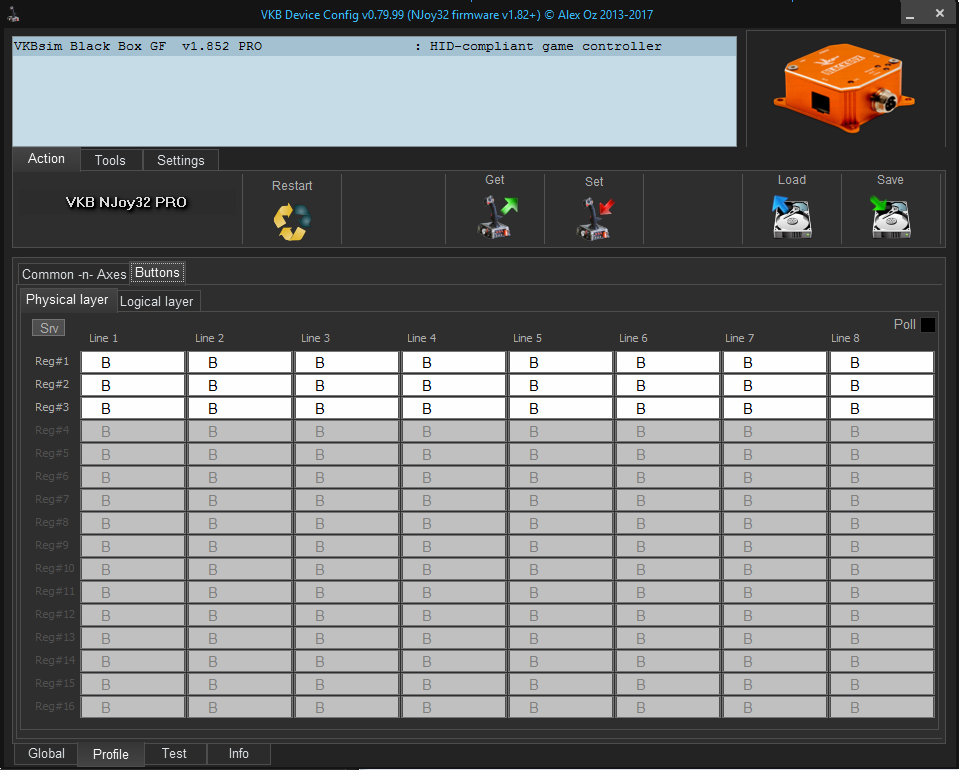 ChinNoobonic wrote:On the buttons page in the VKB config tool, with "Poll" ticked, do any of the slots light up when a button is pressed?