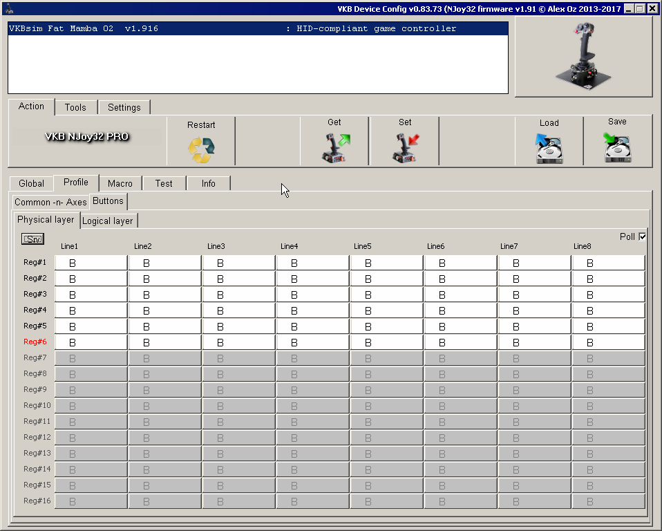 Launch (joystick must be connected). Open Profile - Buttons - Physical layer tab.