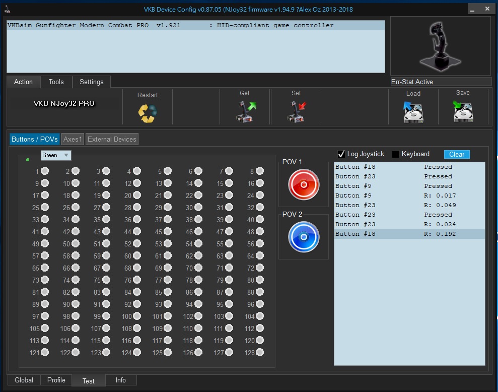 1. When I move the stick, sometimes button #18 (the push in button of the 4 way switch below the POV ministick) and button # 23 (the push in button of the 4 way switch at the front right of the grip) will activate intermittently