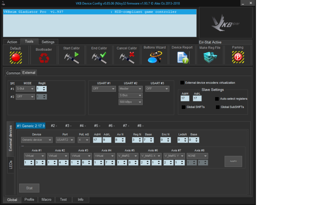 The profile I downloaded shows all 8 axes enabled but in the test section rot x and rot z aren't activated by any controls. The brake lever and up/down movement of the top mini stick on the MCG aren't recognized. The throttle axis on Gladiator Pro base only moves between the far left and the center on the test axis. Any insight would be appreciated.
