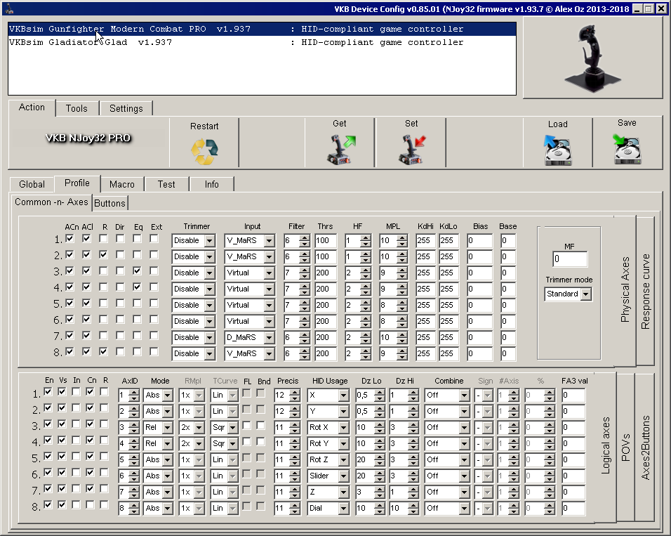 The profile I downloaded shows all 8 axes enabled but in the test section rot x and rot z aren't activated by any controls. The brake lever and up/down movement of the top mini stick on the MCG aren't recognized. The throttle axis on Gladiator Pro base only moves between the far left and the center on the test axis. Any insight would be appreciated.