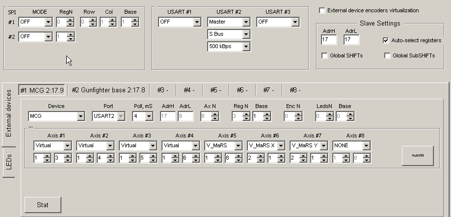 You will see differences in axes mapping (External devises tab of default Gunfighter profile). Axis 5 of Gl is Throttle. Analog type. So Axes 3 & 4 of MCG mapped to 6 &7 Gl Axes, left ministick. That is normal.