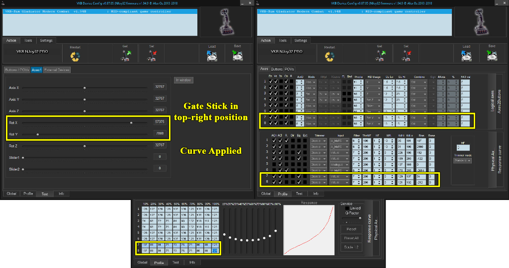 I performed calibration, and it worked perfect WITHOUT a curve applied. I then enabled the response curve and set it just by using "linked q-factor" and dragged the 10% slider to 0 for both axis 7 and 8. Same result as before, I was loosing a few thousand off the limits of both axes when moving the stick to the top-right corner. Again, with the deadzone of 15 at the top and without a response curve it reaches 100% in all corners.