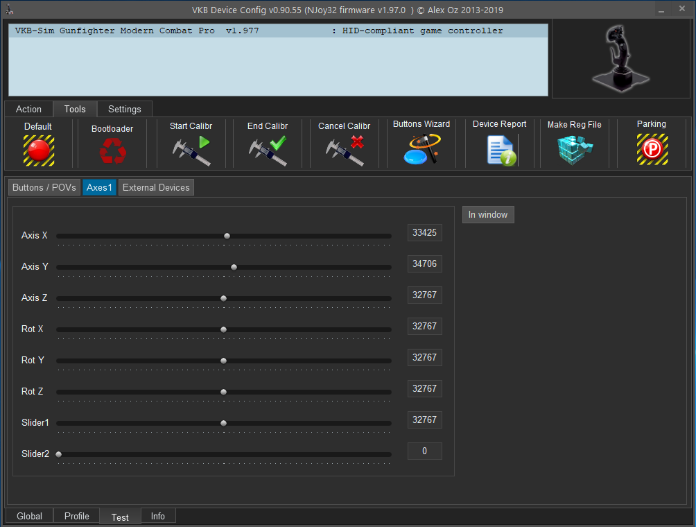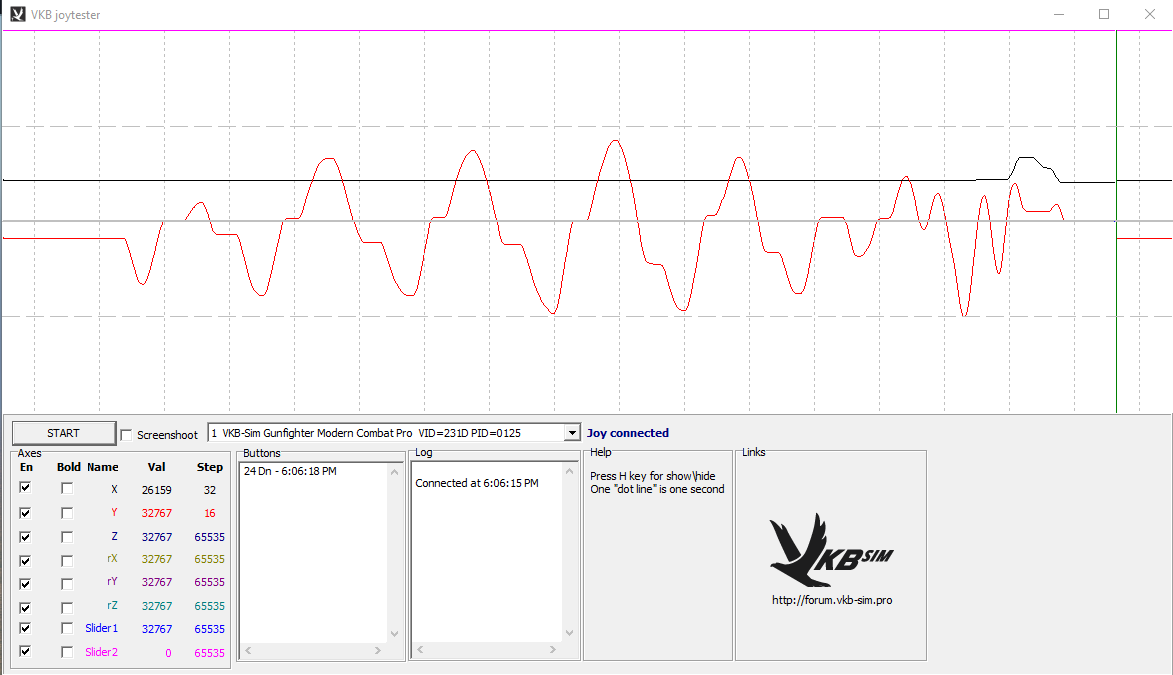 One other thing I noticed when calibrating the stick was that the Y Axis (front to back) , it was difficult to get it to show 0 - 65535. It would do it in the calibration but by the time I ended the calibration and testing the axis setting while observing the values in the VKBDevCfg-C.exe app it would show only 1xxx - 65535 or 0 - 64xxx ... like it was unable to register the full motion. After a few attempts to claibrate, I finally had it showing 0-65535 before I began my axis plot test with the VKB_JoyTester. At the time, I do not think that the disk was loosened again and back to it's position where the two marks line up but I now figure that the stopper was probably back to it's pretty-darn-close-to-loose state. Then, when I was doing the testing with the axis plot, the disk started to slowly move. Not sure if that helps.