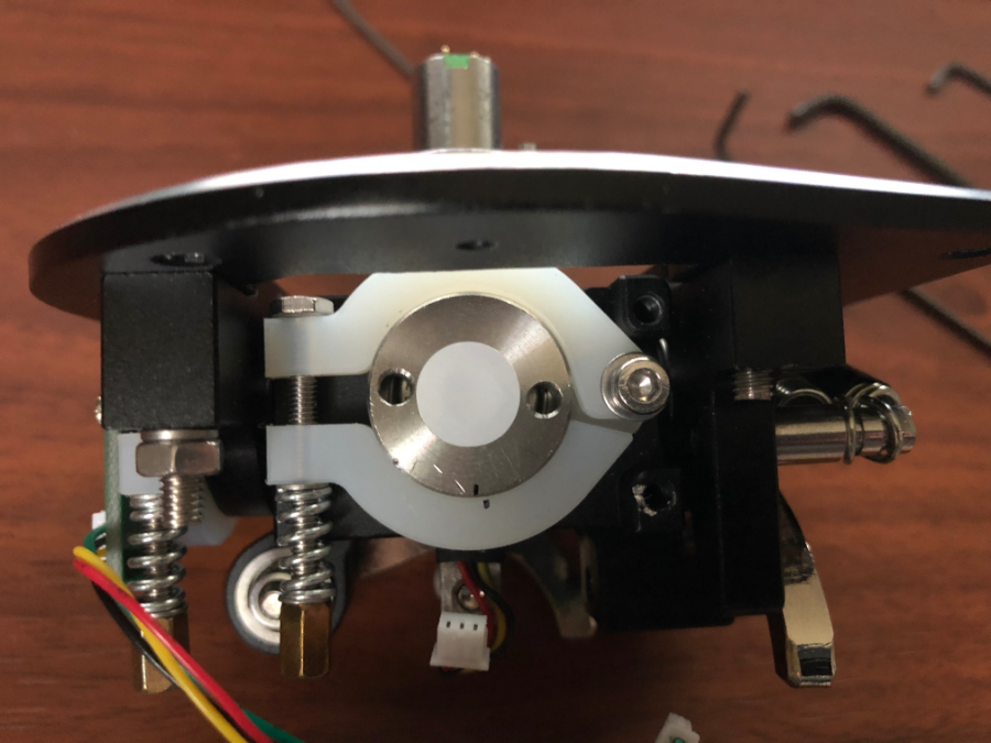 I performed the steps that you mentioned and the disk did indeed tighten (picture #1 in the previous post). I tightened the stopper hex bolt, reassembled the base and began using it. I noticed the problem still happening but it was less severe than before but it seemed to get getting 'worse'. I wondered what if the position of the disk was changing, so I disassembled the base again and noticed that the disk had moved a little back towards its position (picture #2) (where the two black marks where in a line) and that the stopper was loose again (it was not loose enough to spin but it was not as tight as I had set it). I tightened the stopper again, then, instead of reassembling the base again I attached my KG12 grip to the grip post and spent some time moving it around both the X and Y axis. After a minute or so I noticed that the disk has slipped back to its original position (blank marks in a line) and the stopper was loose again. I did apply some significant force to the stopper to tightened it I did not over do it.