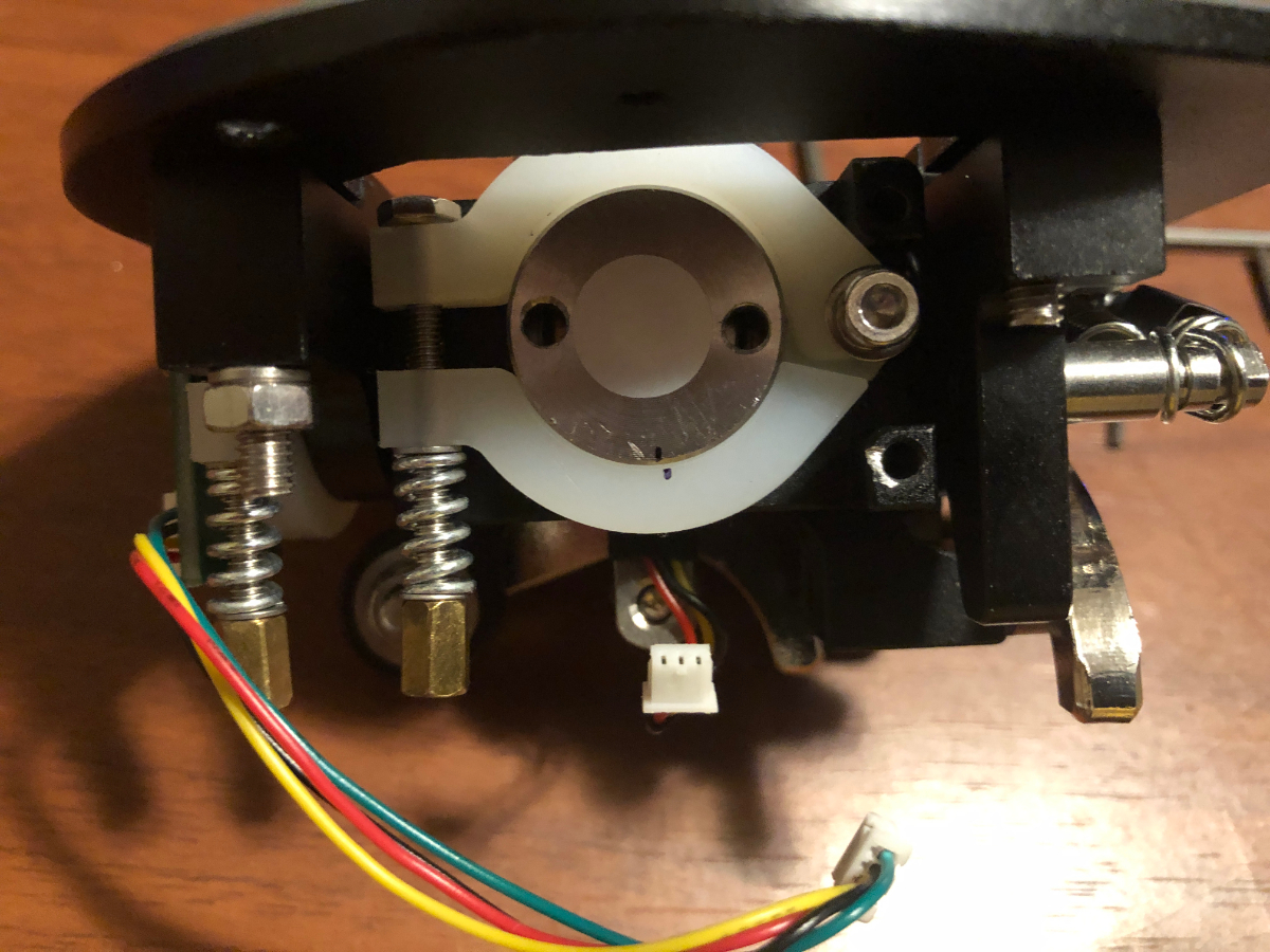 Maybe I have something. I was about to head out of the house and it started to rain so I thought I would take 10 minutes and poke around at the disassembled base. I noticed a little hex key bit on the Y Axis gimbal (?) mechanism: