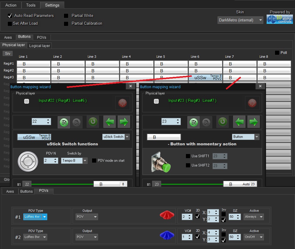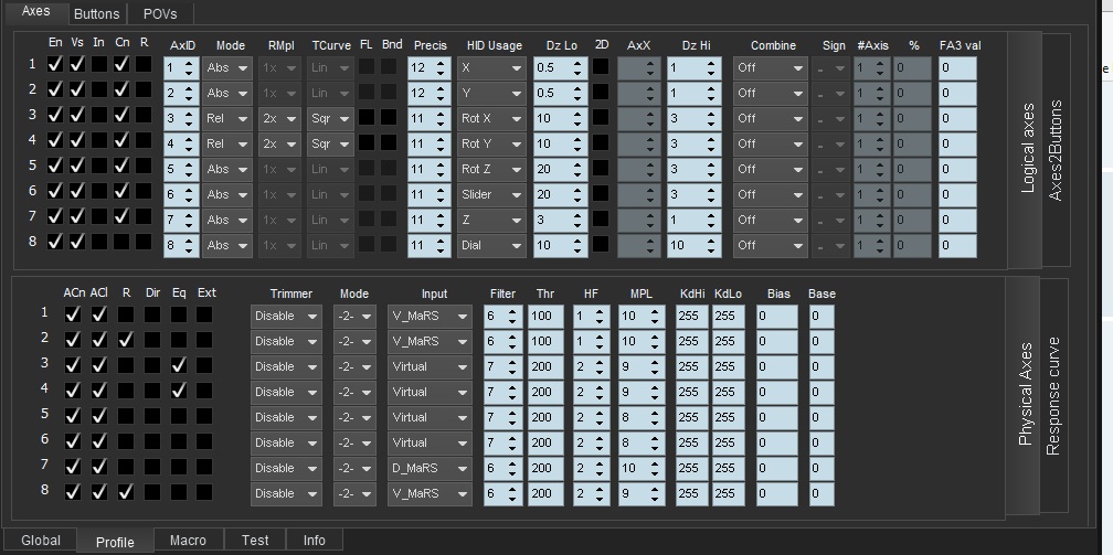 Thank You. I have twist axis and I have the trudder axis. It's working now...but this setup swapped functionality of POV hats. Now the Left circle hat has the 2seconds press (switch from XY sliders to pov hat with reset with single press) and the top rectangle hat has simple 4way hat function. Before the top rectangle hat has the switch pov/sliders (default factory) functionality. How to bring the default hat functionality and have the twist and trudder axis?