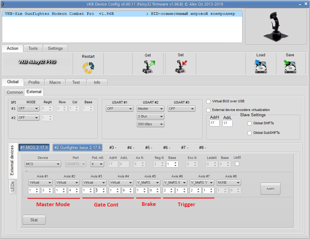 We make Hat from the first stick (3, 4 axes) and at the same time transfer it to the second virtual controller (2-2,2-3).