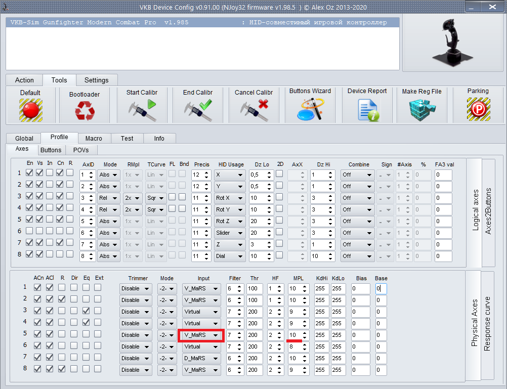 Thank You. I have twist axis and I have the trudder axis. It's working now...but this setup swapped functionality of POV hats. Now the Left circle hat has the 2seconds press (switch from XY sliders to pov hat with reset with single press) and the top rectangle hat has simple 4way hat function. Before the top rectangle hat has the switch pov/sliders (default factory) functionality. How to bring the default hat functionality and have the twist and trudder axis?