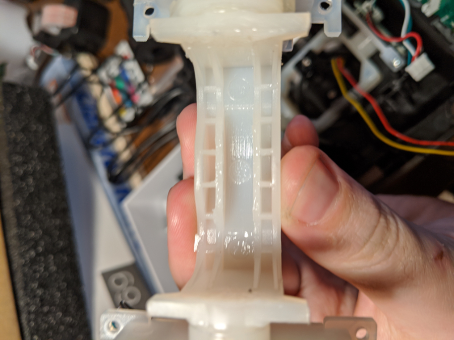 You can clearly see the molding marks on the picture. The peg is touching a very little bit of the top and side cover of the axis and it makes the grinding noise. I tried to drown it in different kind of grease but no sucess since it's so tight. And washers can't help since it grind the sides too.