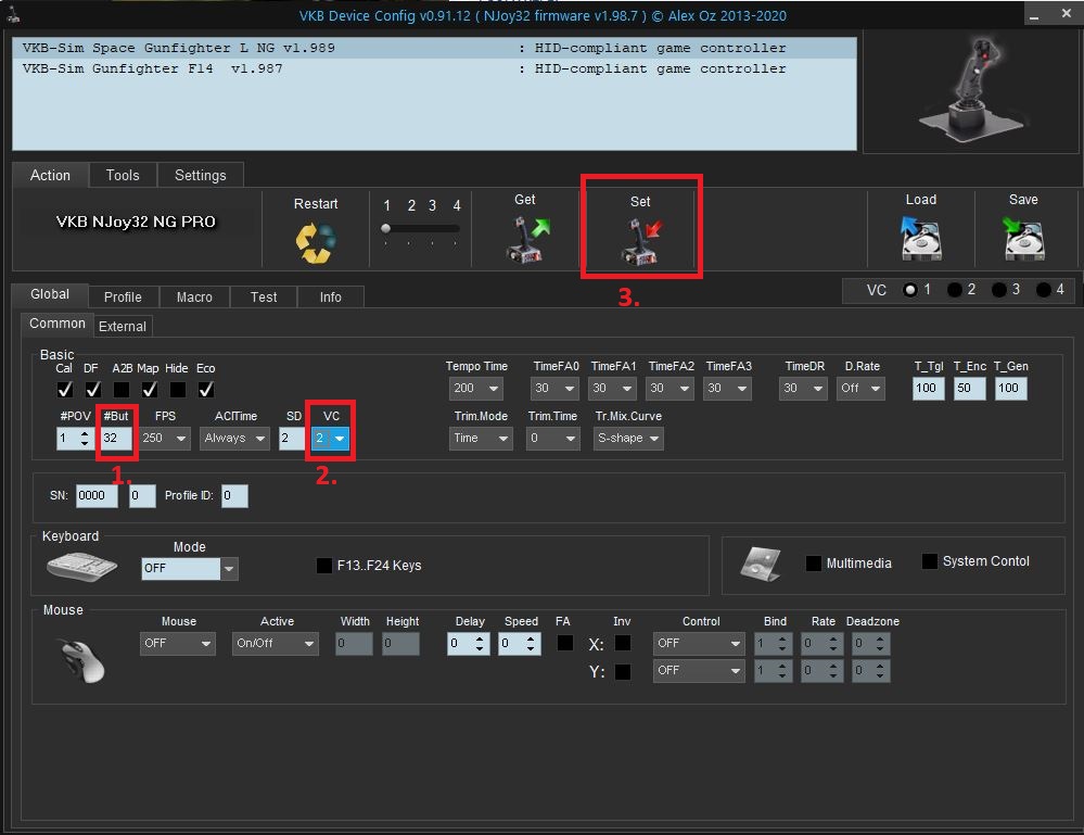 - set the #Butt (1.) to 32, VC (2.) to 2 and hit the Set button (3.);