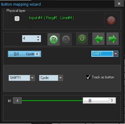 I set it up as the shift modifier button. Shift1 Alternate means it alternates between Shift0 and Shift1 modes when I press it. Track as button means it also presses the button 3 each time I press it. By default the stick is in Shift0.