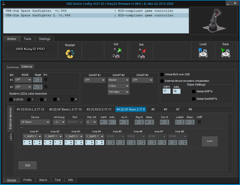 Please take screenshots of the Global-External Devices tab when connecting different bases. The selected parameters are of interest.
