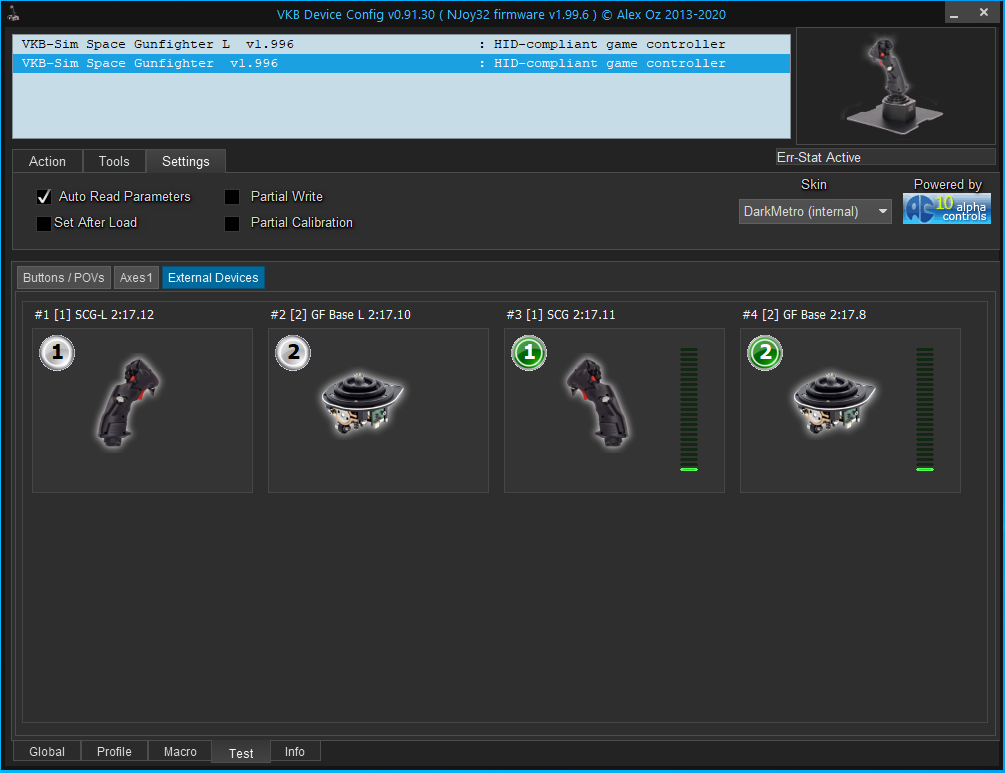 I have re-flashed and calibrated both joysticks on a separate machine, and when reconnected to the primary only the left stick is detected by Windows. The right joystick is undetected, but is receiving power and potentially signal. The LEDs on the stick and blackbox light up, but only VKBDevCfg is able to detect it. Sadly, my VKBDevCfg is still affected by Application Hang (Error 1002) errors so other than detecting the stick exists, the program is unusable.