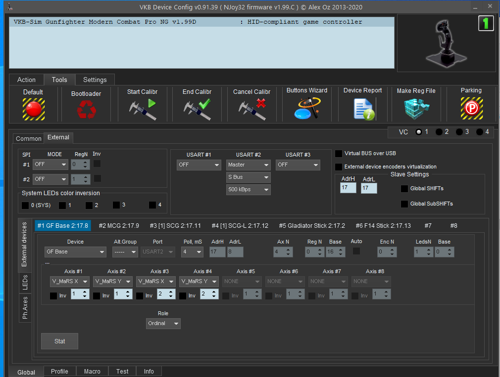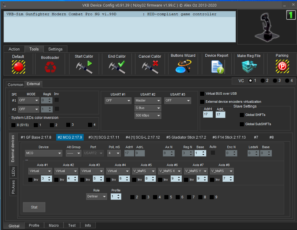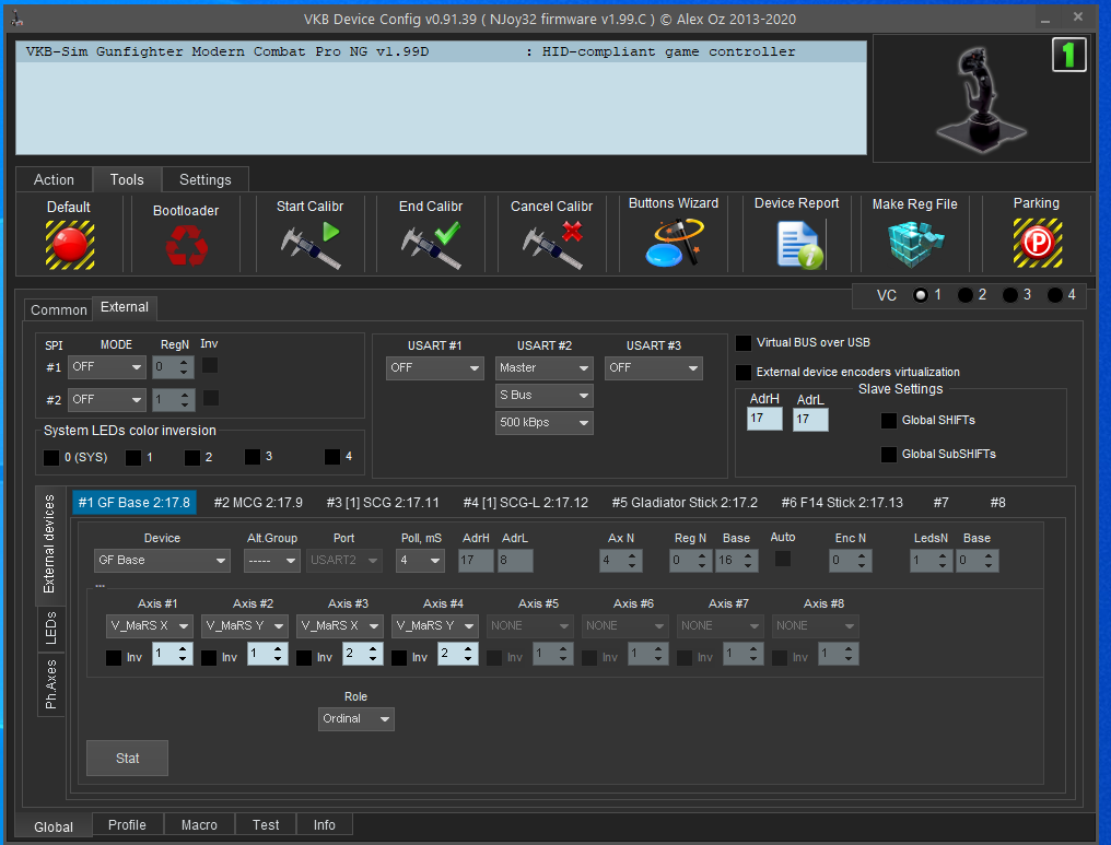 I see uncalibrated axes of 2x microsticks. Did you calibrate them? Show screenshot of Global-External-External Devices tabs. And Profile-Axes. Do not crop the screenshot, show the full configurator window.