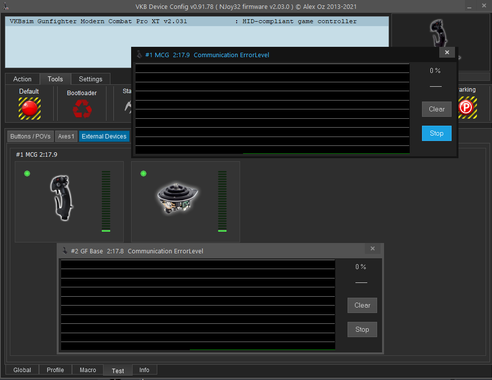 Same as above, updated screenshot please. Also screenshot with Test/External Devices, click on grip and base and include the Comm Error windows in screenshot.