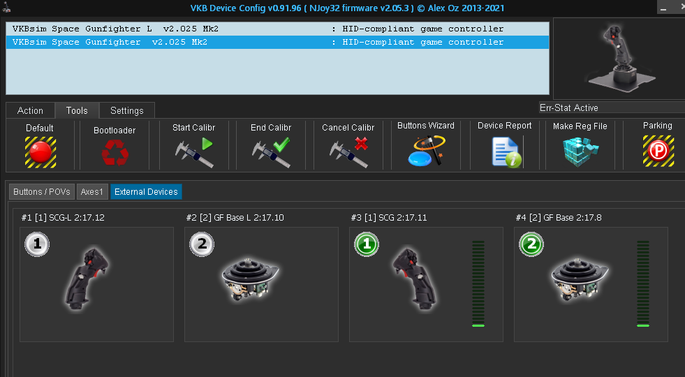 Don't worry about the items listed in External Devices, it's normal for the SCG grips to have shadows in there. Click on both green base and stick; you'll get 2 new windows with the communication error level. If everything is right you should get a continuous green line flowing from right to left. Some small green blocks on that line are acceptable, but if you get yellow, orange or red, tall blocks then there's a problem. Keep the windows active on your desk and when your LEDs are flashing again take a screenshot and post it. You could force the issue by simply moving the stick around and see if there's any feedback on the charts.