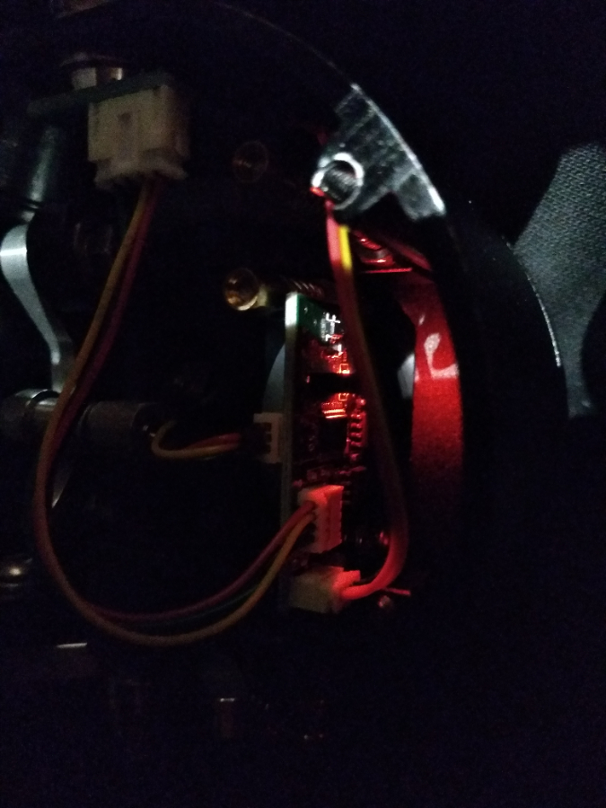 This happened as I reassembled the base, after having significant ghosting and calibration problems on one half of the X axis (towards negative values). I was checking the wires, and tried reversing the connector from X-axis PCB to the main PCB with the LED light.