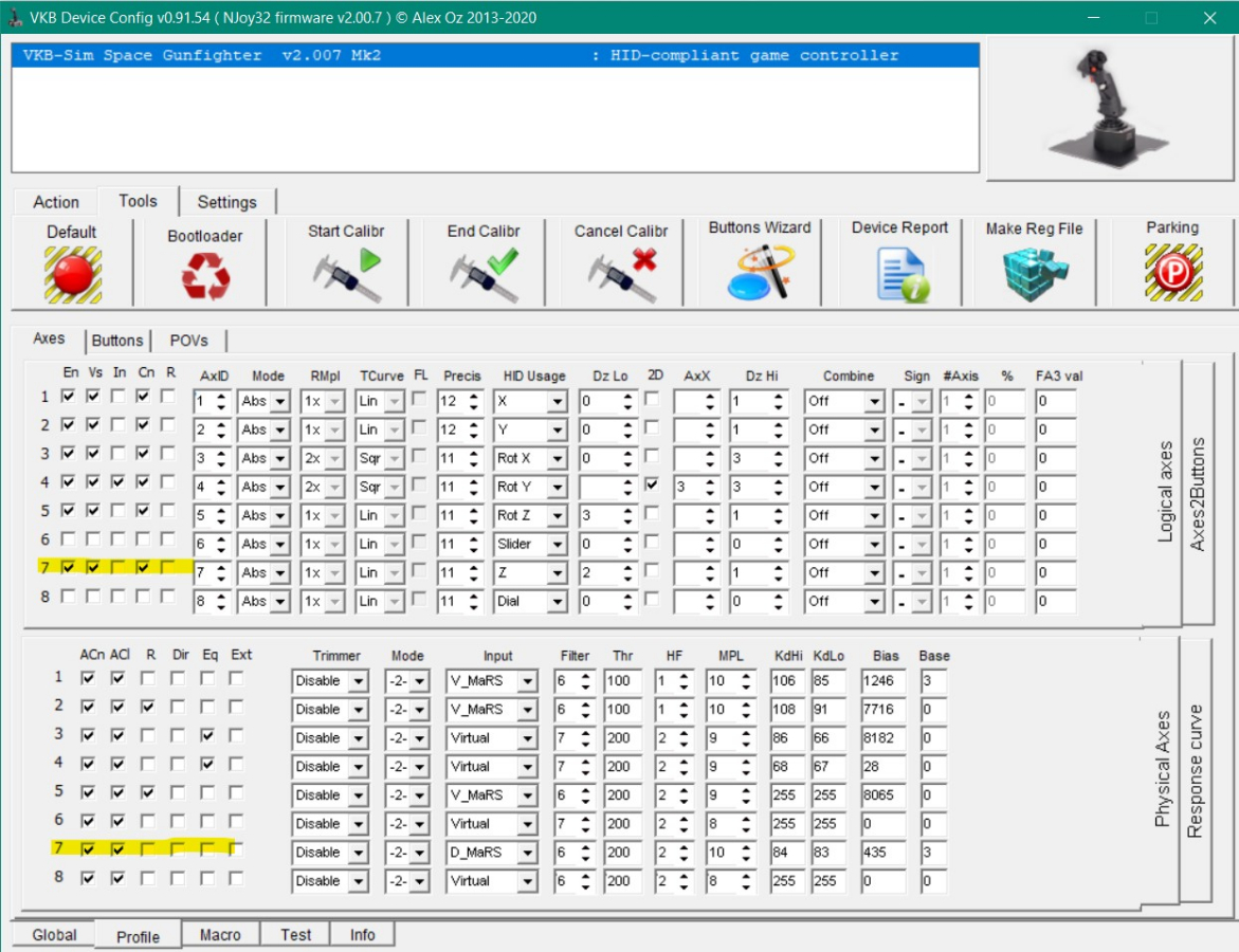 Not sure what the indicator is for a calibrated stick. My GF stick (the one the pedals are attached to) is hanging loose in the forward position, which is why the value is not zeroed out. Also, I set the DzLo to 0 myself, I was assuming this is the deadzone setting and eliminated it for more consistent performance crossing the 0,0 position (as I use the stick mainly as a helicopter cyclic, and it rarely sits at 0,0).