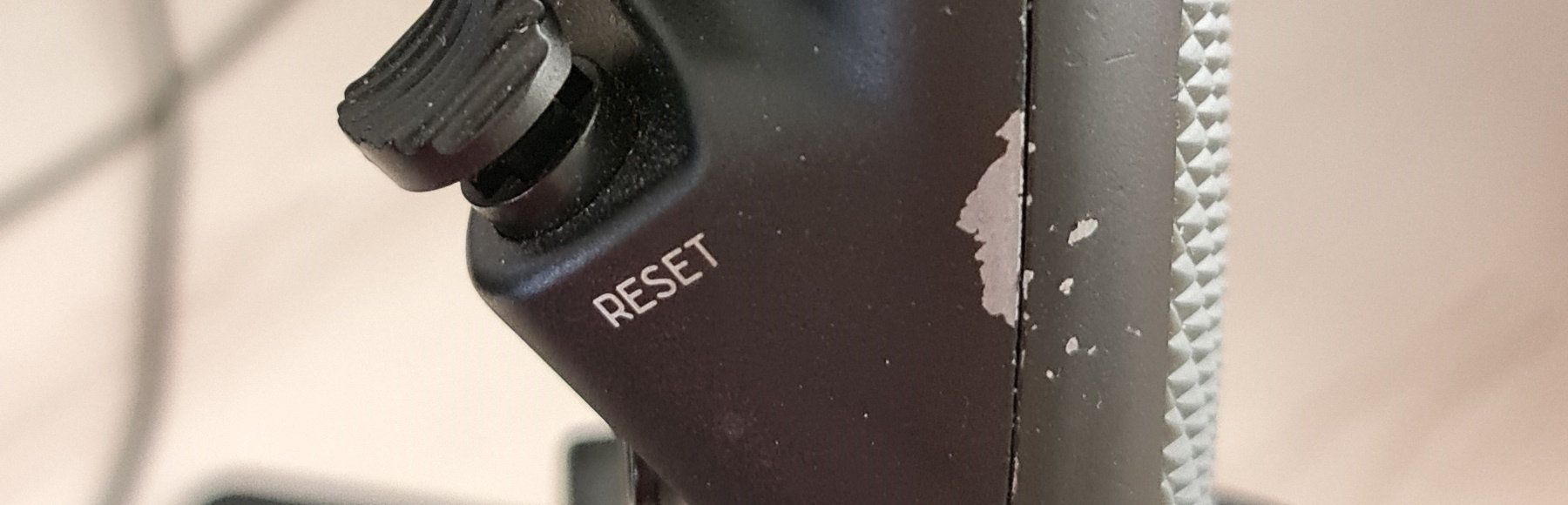 Also, I noticed that the paint on the grip is peeling off, revealing the metal material below it. It is evident that the location of the peeling is where I apply forces to the stick during maneuverers in sims, thus, I am concern that it will continue to peel and accidental scratches might spread the peeling. First image shows the peeling on the dorsal part of the stick, where the thenar (or mount of venus) of my palm rests. Second images shows the peeling on the right of the stick, where the proximal part of my index and ring fingers are positioned.