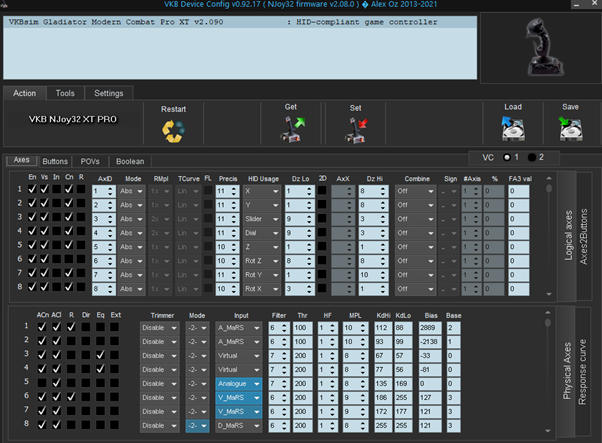 hi, I have a Gladiator MkII Pro base with MCG Pro grip + twist adapter. A MkIV Rudder is also connected into the base, making the total number of axes in this set up 8: X,Y the base throttle wheel, the grip's ministick X & Y and brake lever, the twist adapter AND the rudder pedals.