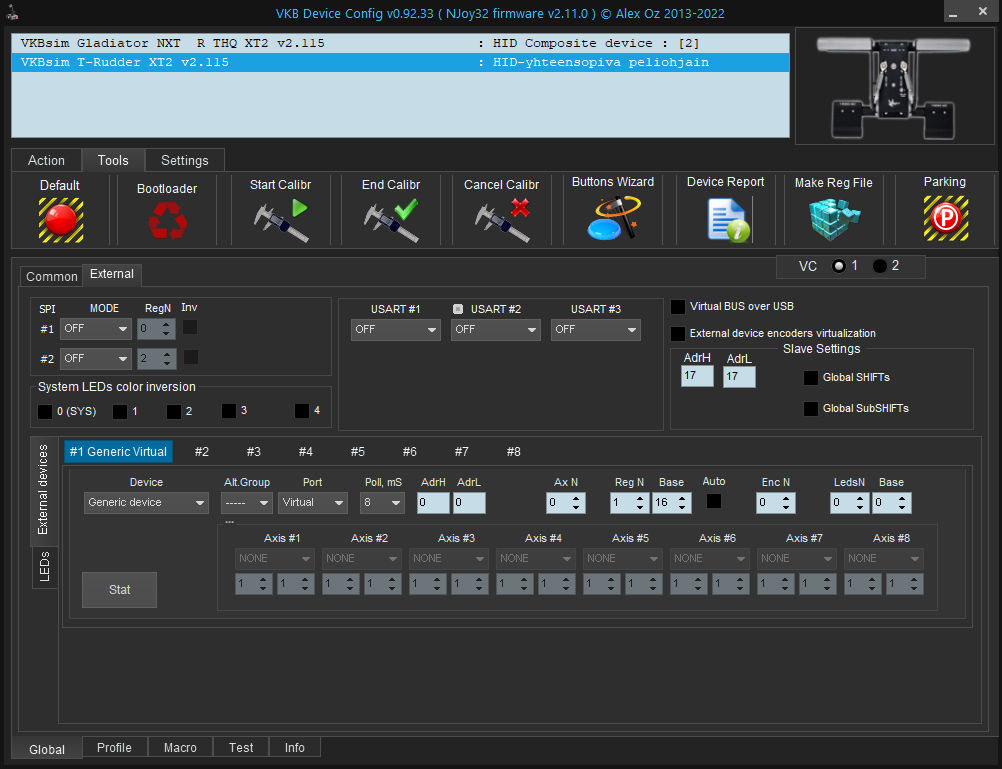 I got new T Rudder pedals. I'm using latest Config v0.92.33 software and latest firmware for VKB NXT R +THQ XT2 v. 2.115 and TRudder XT2 v. 2.115.