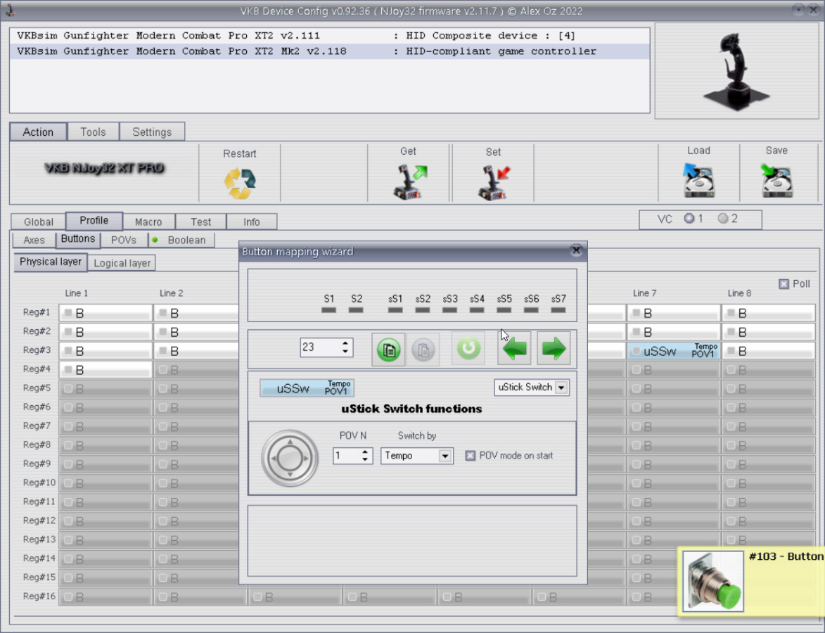 Translation to human. Virtual button #25 will be registered if POV mode is ON AND physical button #23 is shortly pressed. If long it resets POV to axes. In this state (POV off) but. #23 press will not cause but. #25 registering.