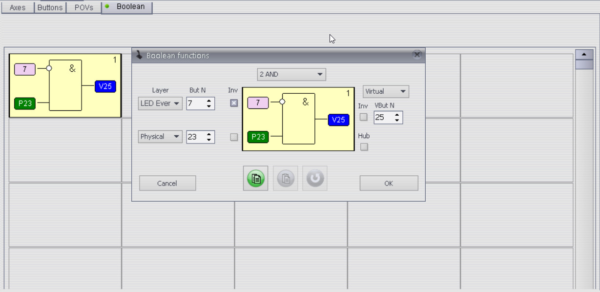 Boolean 2AND function. Output is registered if both inputs are on. 1st input is LED event #7. What is it? Open Global-External-LEDs tab. Event #7 registers if POV #1 is NOT active. It is default setting.