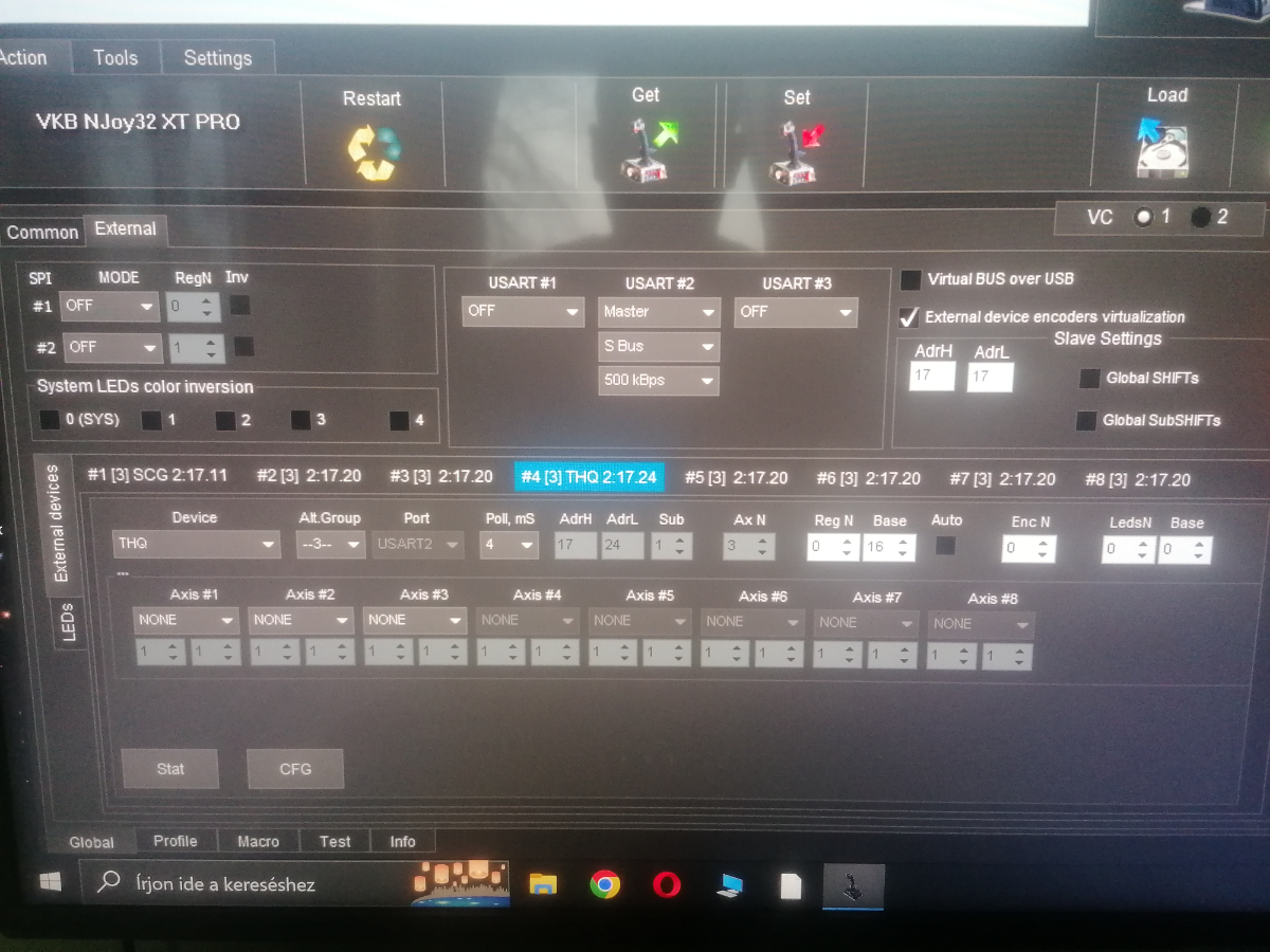 Hello! I have an nxt with an attached thq module. Yesterday i messed up the settings while trying to split the twist axis, so i pushed the default button. After that, i recalibrated the device, and even managed to split the axis correctly. However, since that, if i click to finish calibration, the thq axes and buttons stop working. I tried to reset everything to default, the thq axes are visible and moving while calibrating, but every time i try to finish calibration, in the "test" panel the slider 1,2 stops in middle position, and the folding menu disappears where i could choose the third axis of the thq, which the rightmost lever belonged. What could be the problem? I tried to search this forum, but everywhere they mention the find and autoconfig button, that i can't find.