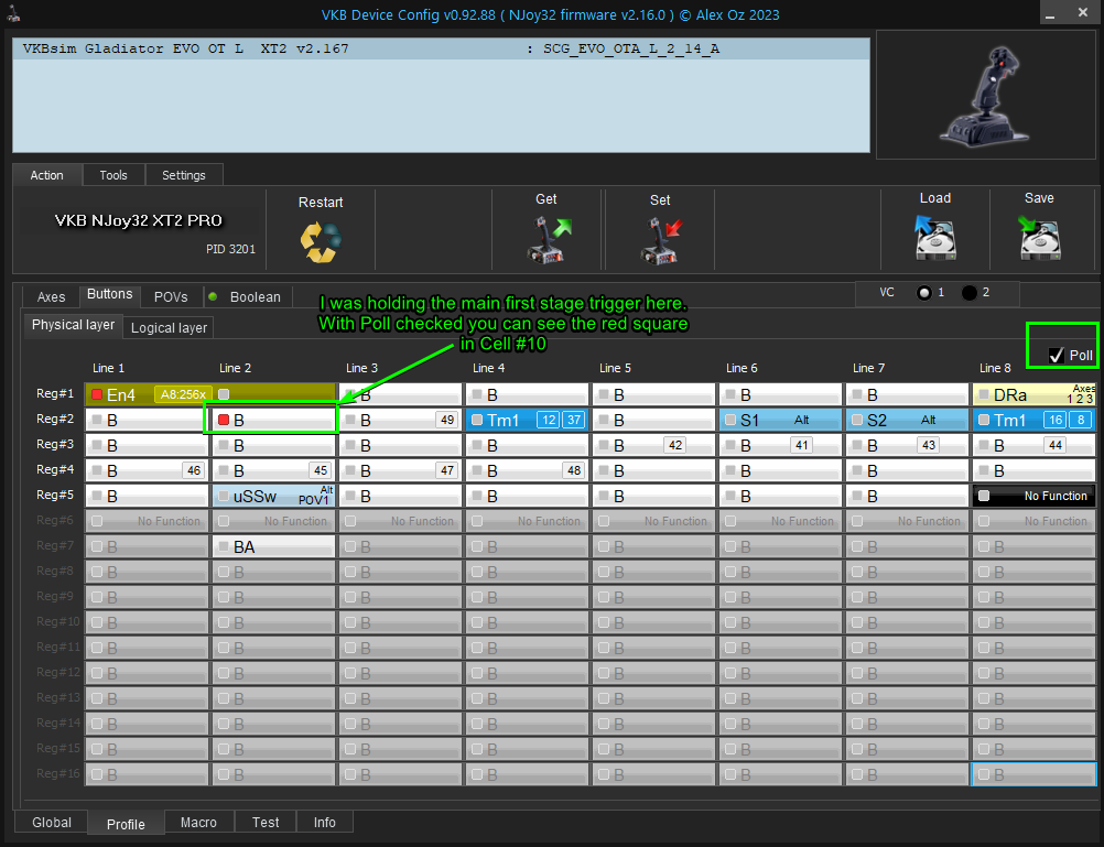 To find which Cell ID is tied to which button on the device you use the Poll checkbox to see a red square on the indicated Cell when a button is pressed.
