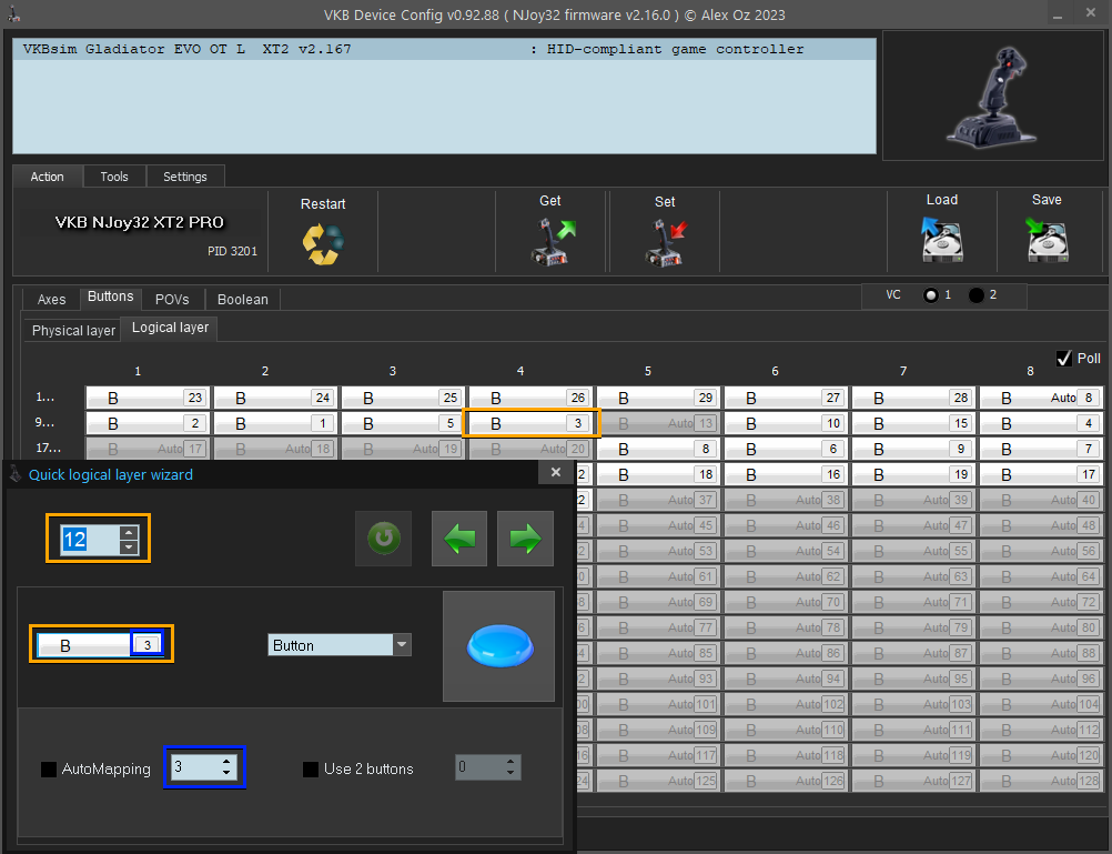 When you hover a Logical button cell it will open a little popup that shows the Virtual Cell ID in bold and the Logical joystick button # that is sent to windows on the right of the popup window.