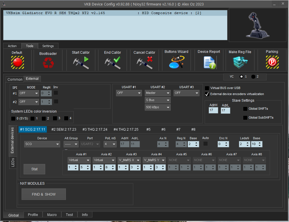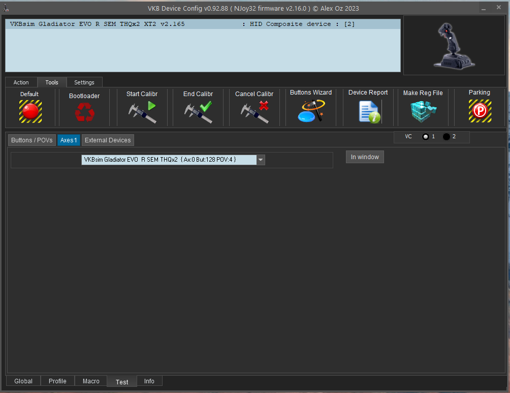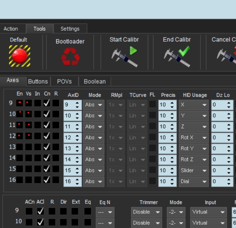 It is so close now. I have everything working except the 12th axis with is VC2 axis 4. As soon as I select the checkboxes En and Vs and then click the set button to send it to the joystick, it restarts and fails to start. I have to unplug it and hold F1 and F2. Then it restarts and I can load the saved profile with 11 axis set.