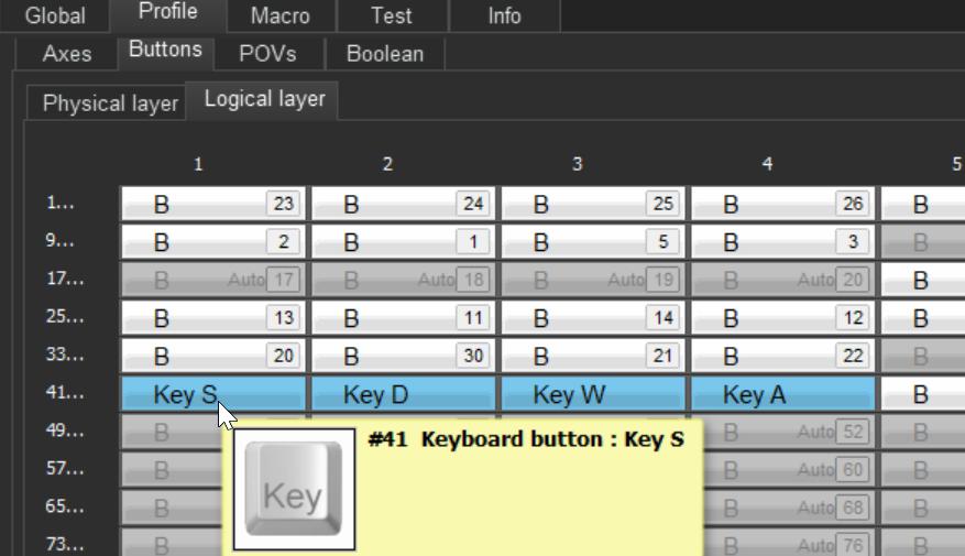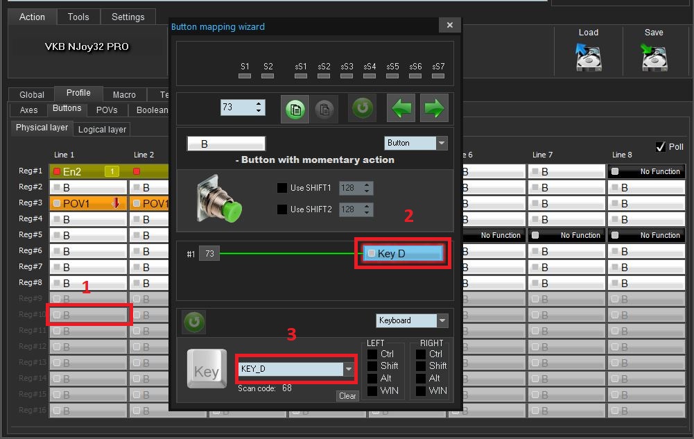 3. In the new window click on the logical representation of that button (2 in pic 2), then set it as keyboard D (3 in pic 2); do the same for the next 3 buttons: assign button 74 to keyboard A, button 75 to keyboard S, button 76 to keyboard W; close that window;