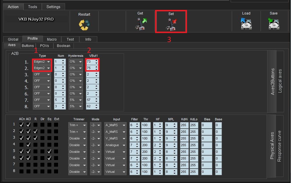4. In Profile/Axes/Axes2Buttons set the Type of axes X and Y as Edges 2 (1 in pic 3), VBut1 to 73 for Y and VBut1 75 for X; press Set to save.