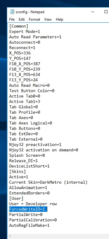 My Zconfig.ini File looks like this. I put in the extra string and do not see the button your are talking about. Also I put in another string ForcedWriteID=1 that was supposed to let me see some sort of button macro tab. I never seen that button either.