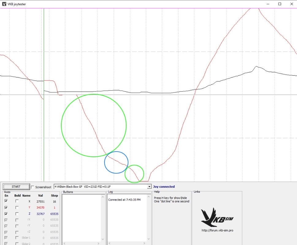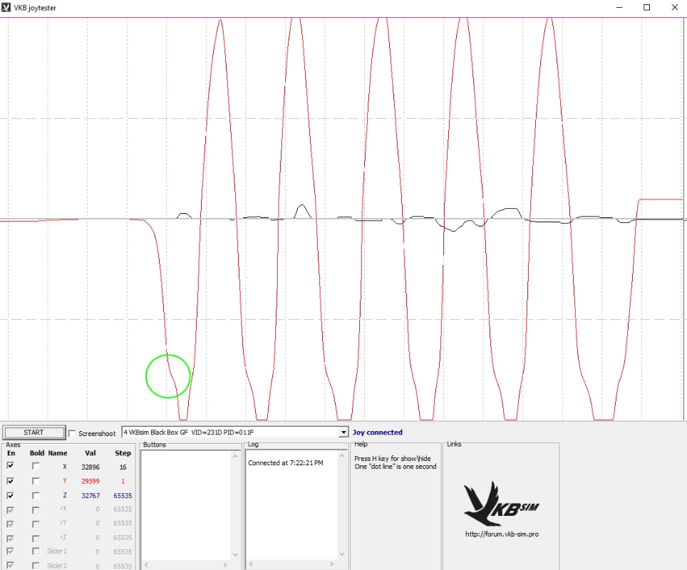 I have noticed that there is a strange 'step/spike' in my y-axis. It isn't a physical step, in that the spring tension increases in a linear fashion through the y-axis rotation. However when pulling the stick towards me there is a spike in the graph. I have tried running the VKB Device Config tool to calibrate the stick multiple times, but I can't get rid of this step. It is noticeable enough that it is affecting control of the aircraft, which is how I discovered it to begin with.