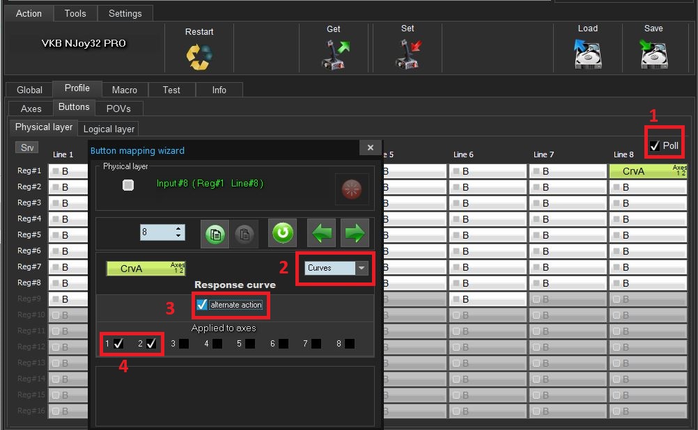 2. Go to Profile -> Buttons -> Physical layer. Mark the Poll option (1). Press the joystick button you want to assign for changing curves. Red light will flick on the buttons layout. Click that button. In the new window set that button as Curves (2), mark the Alternate option box (3), mark the X and Y axes (4).