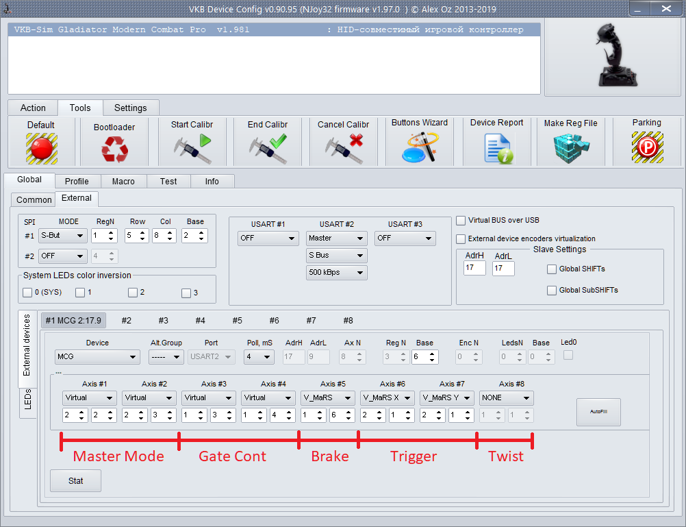 If you connect twist to the 7th axis, we only have the eighth axis unused. And therefore, it will not work to make a full-fledged microstick from Master Mode (with 2 axes). Something needs to be turned off. Either the throttle axis (5), or the brake axis (6), or a twist (7). Here is an option with twist disabled.You need to configure the uStick Switch button for Master Mode in the same way as Gate Cont.