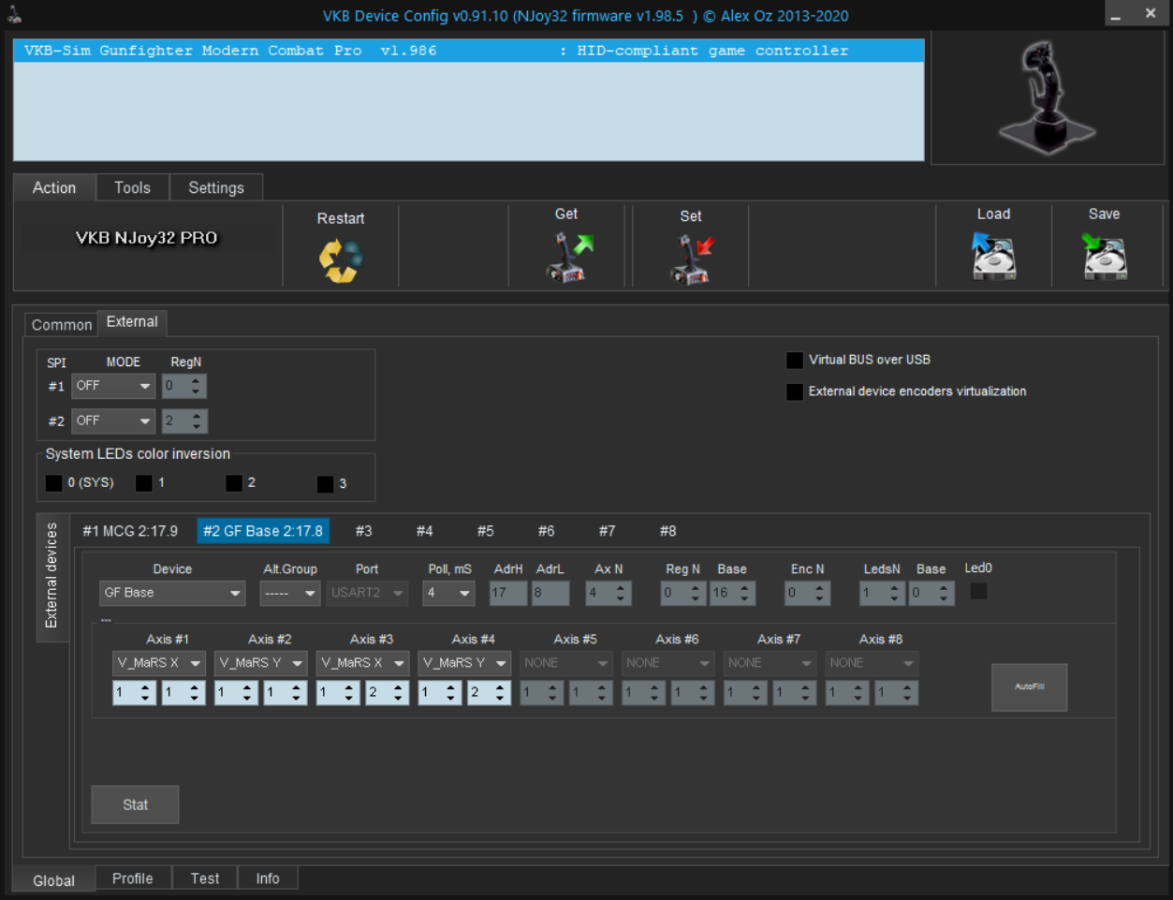 I have an MCGO Pro with twist and a GF III base. I have T-Rudder Mk. IV pedals attached to the same BlackBox. Everything is on firmware 1.986 and I am using VKB Device Config v0.91.10.