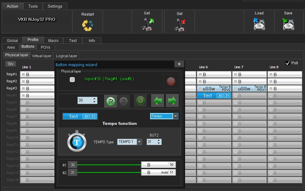 Set physical button 22 as uSSw for POV2 switched by TempoB. Link it to physical button 30: