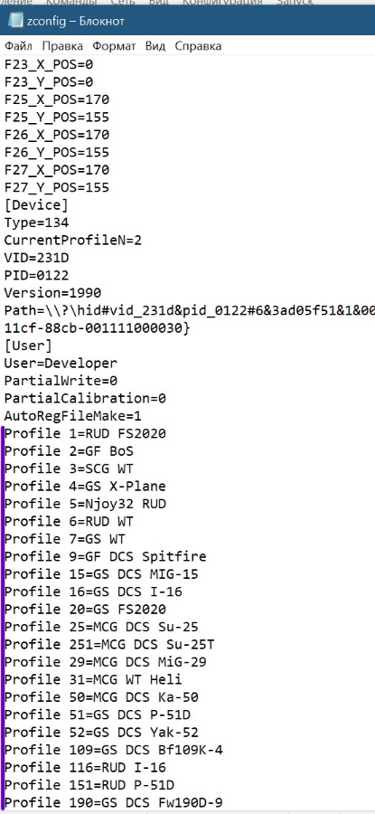 Naturally, don't forget to calibrate them and bind the POVs to the new axis layout. We add the profile numbers to zconfig.ini, write the desired number to Profile-Common (after that Set is required), save it to the Save disk and immediately see the name of the profile when loading the profile.