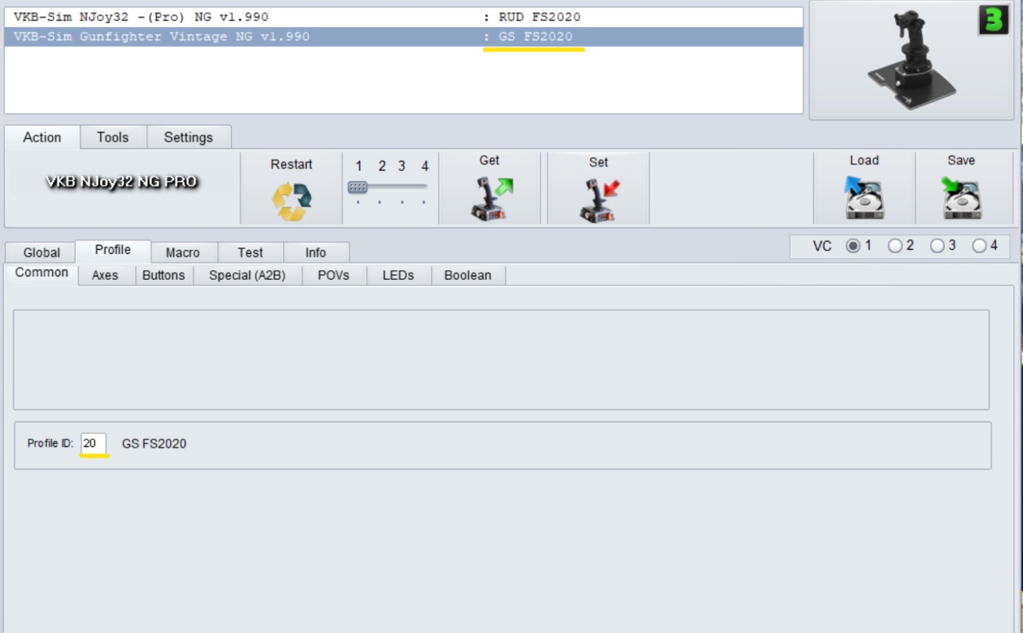 And the buttons will be detected (but with a layout deriving from the MCG Pro profile so not correct) and the device name will still be VKB Gunfighter Modern Combat Pro...while it should be VKB gunfigher vintage, and the profile is still the number 1 (should be number 3)