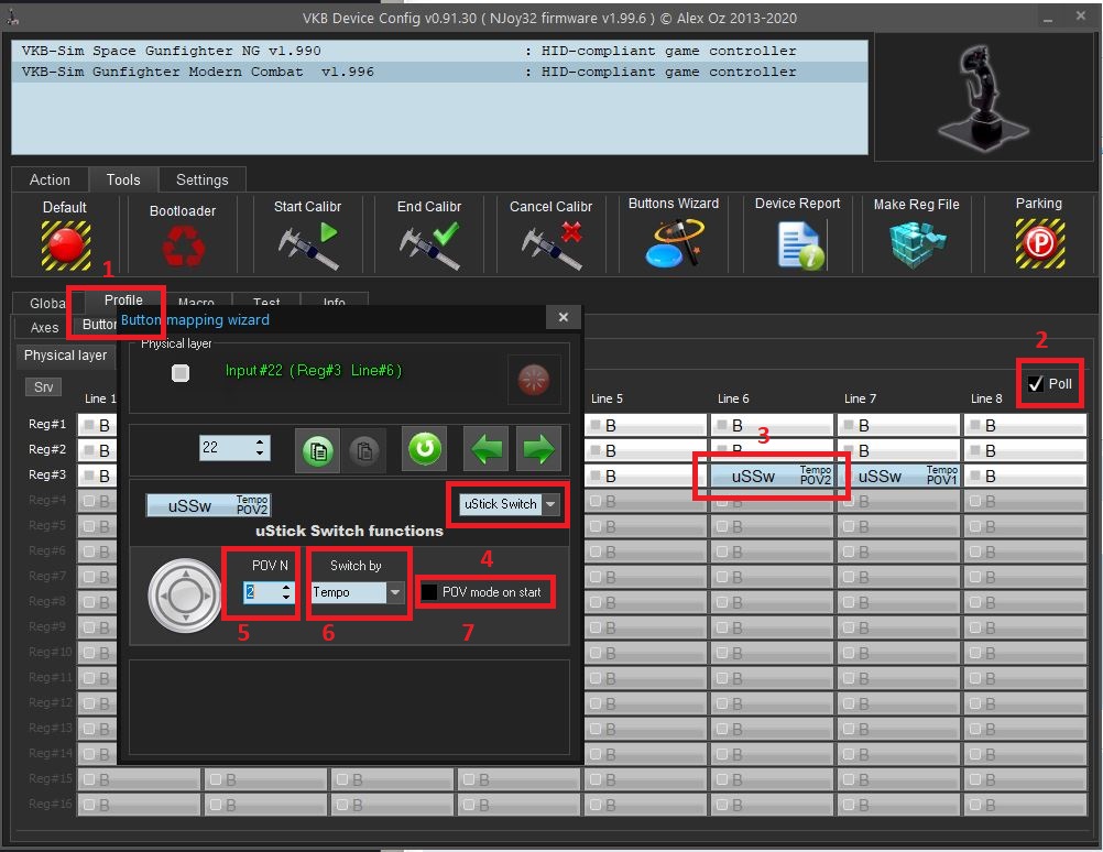 - open VKBDevCfg and make sure you're calibrated before this procedure; also that POV# is 2 in Global/Common;