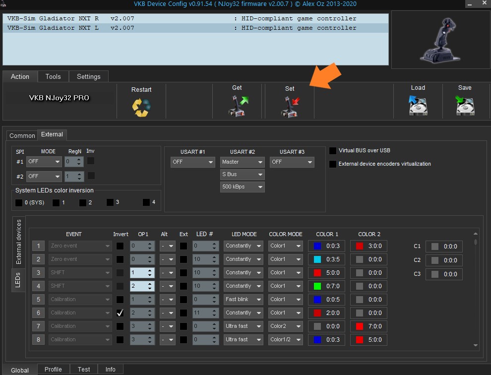 I really liked the idea of being able to change the Main RGB LEDs color however I found an issue after using the VKB Device Config software to do so. Changing the color and behavior of the RGB LED (this LED is called LED #10 in the config software) you have to use the "Set" function to write the new parameters to the joystick and set the new color. Upon doing this I noticed that the indicator LED for the POV / Hat switch (switch position "A1" on the Gladiator NXT premium) no longer indicated and lit up when the mode was switched, instead it would now remain dark. To only way to regain the functionality of the LED that I have found, is to revert the device back to default on-board firmware settings with the Config software.