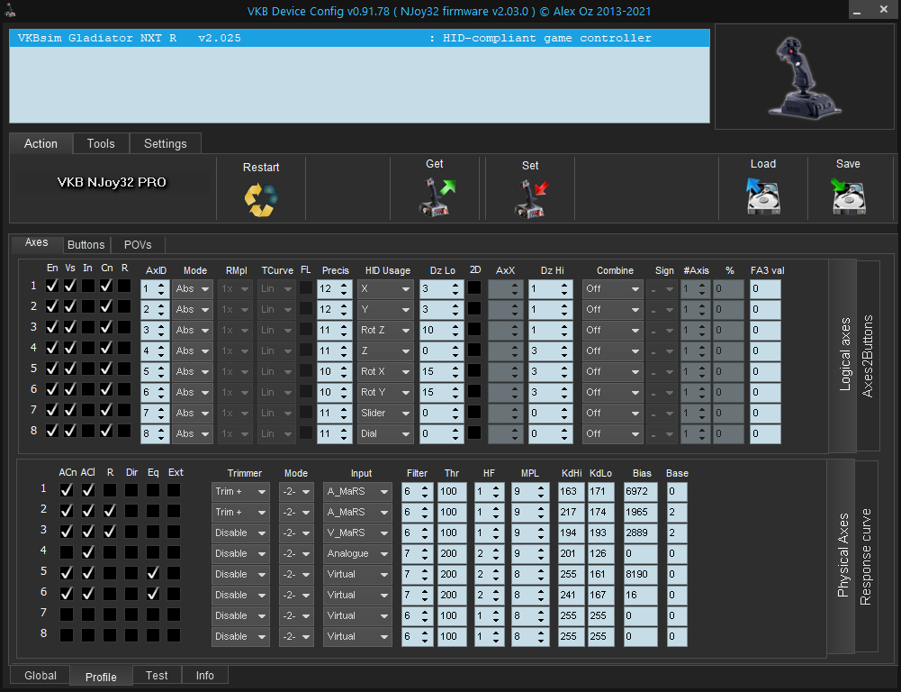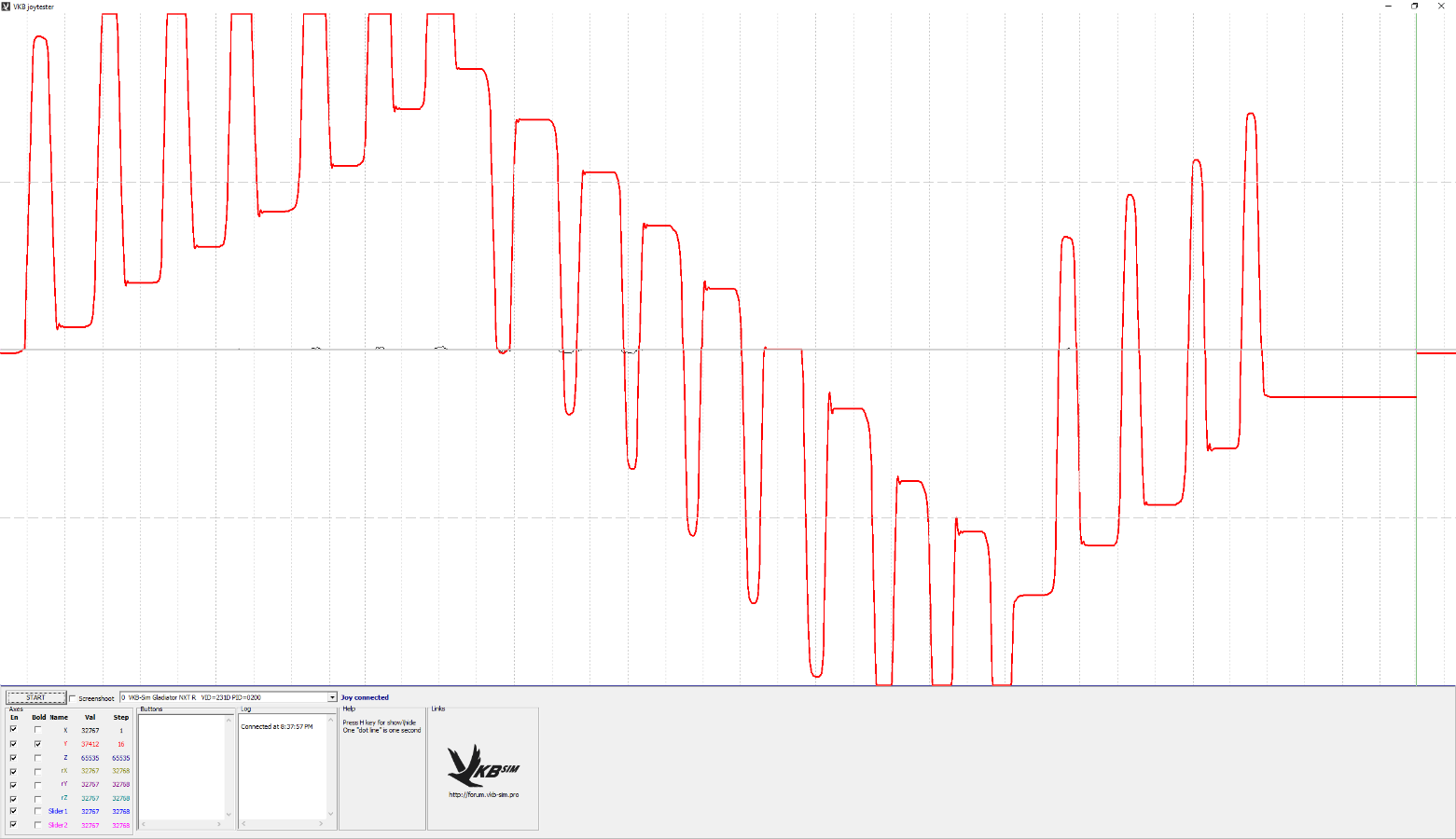 I have a really weird issue with the Y-Axis on my Gladiator NXT. When I push forward on the stick and then return to center, the value of the Y-Axis emitted by the stick is shifted forward, as if I were holding the stick slightly forward. The amount of drifter increases with each cycle of pushing forward and then returning to center. Eventually this results in the joystick basically emitting a Y-Axis value as if I were holding it fully forward, when in fact it is in the neutral position. The same issue occurs when pulling the stick back and returning to center. See the attached VKB Joy Tester screenshot for a visual example of what's going on.